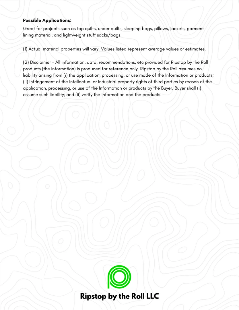 This silnylon is a great fit for projects such as tarps, tents, ponchos, gear sacks, pack covers, or any application where waterproof/windproof fabric is needed.