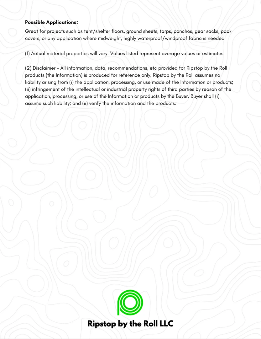 Great for projects such as tent/shelter floors, ground sheets, tarps, ponchos, gear sacks, pack covers, or any application where midweight, highly waterproof/windproof fabric is needed.