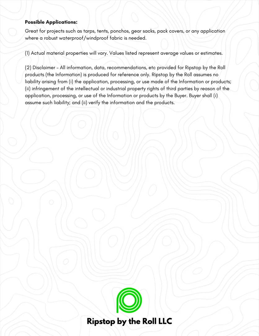 • Weighing just 1.6 oz per square yard, this fabric is incredibly lightweight, making it perfect for backpacking, camping, and other outdoor activities.