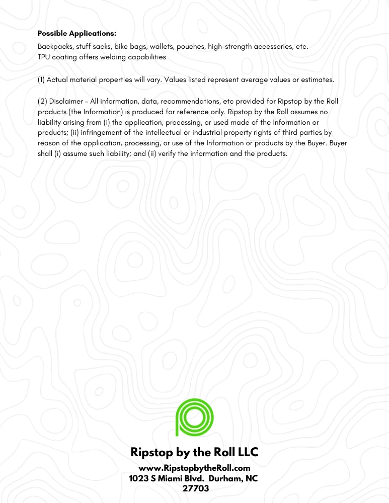 TPU coated both sides to >3000 mm Hydrostatic Head (*can be heat bonded or RF welded, but keep temps in mind because of UHMWPE content) |